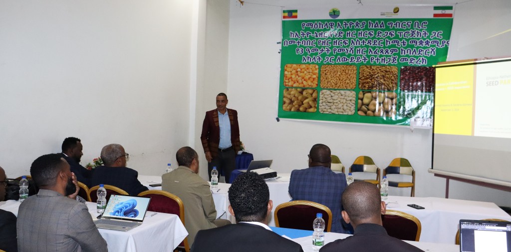 During the workshop, Mr. Mekonnen Gaso presented a comprehensive draft document detailing the rationale for establishing the seed coordinating committee, anticipated deliverables, proposed member organizations, their respective roles and responsibilities, the committee’s functions, and the frequency of meetings to fulfil its obligations. Mr. Mekonnen emphasized the growing need for enhanced and high-quality seed production, underscoring the imperative for robust collaboration and coordination among stakeholders. He stressed the necessity for a capable entity to spearhead coordination efforts, comprising key seed sector participants.