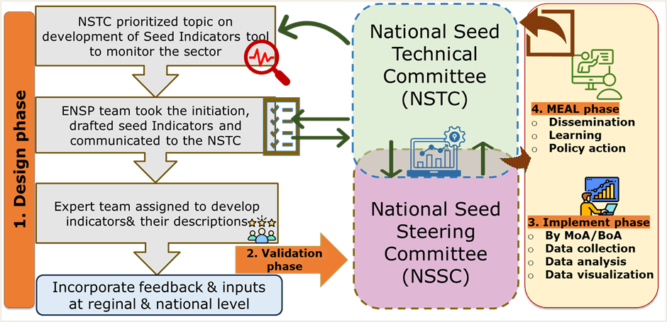 The overall flow of the seed sector monitoring tool development process and implementation plan is indicated in chart 1. The ESP staff and senior seed experts assigned by the National Seed Technical Committee have worked together and designed the tool. Key seed stakeholders at national and regional levels were also consulted in a one-day workshop organized. Inputs and feedback from the stakeholders are amended to finalize the tool. The next step is to validate the tool and facilitate its implication at national and regional levels.